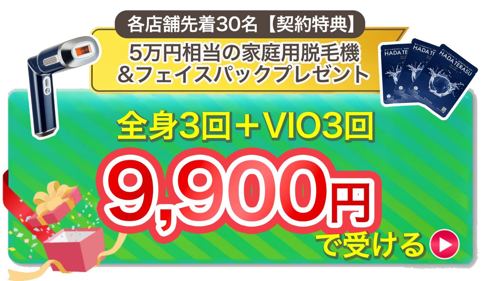 ※家庭用脱毛器の特典ははプラチナ18回美肌コースをご契約いただいた方が対象